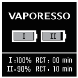 Po vklopu OLED prikazuje upornost napetosti, raven baterije, temperaturo, izhodno moč itd. Zaslon se bo po 10 sekundah neuporabe spremenil v uro realnega časa, ura realnega časa pa se bo izklopila po 15 minutah neuporabe. Enkrat pritisnite gumb "+" ali "–" ali gumb za način in zaslon se bo osvetlil s prikazom ure realnega časa, ponovno pritisnite gumb "+" ali "–" ali gumb za način in zaslon se bo osvetlil z glavnim menijem. Kadar koli pritisnite gumb za vžig in zaslon se bo osvetlil z glavnim menijem. - Samodejno prepoznavanje atomizerja: