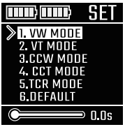 Ko ste v načinu VW, trikrat zaporedoma pritisnite gumb za način, da izberete CCW. Izberite in pridržite gumb za način, da potrdite in izvedete morebitne spremembe linije moči z gumboma plus in minus (čas pospeševanja in posledična zmogljivost); premaknite se na naslednjo vrstico s hitrim pritiskom na gumb za način. Ko so vse spremembe končne, pridržite gumb za način, da shranite in izstopite.