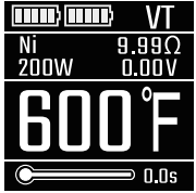 Samodejno prepoznavanje atomizerja: Za doseganje boljšega učinka nadzora temperature bo mod vprašal uporabnika, ali je pritrjen nov atomizer. " OLD LOAD: -, NEW LOAD: + " ("STARA OBREMENITEV: -, NOVA OBREMENITEV: +") se bo pojavilo na zaslonu. Če je pritrjen nov atomizer, pritisnite " + ", mod bo prebral novo upornost; če ne, pritisnite " - ", mod bo prebral zaklenjeno upornost.