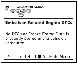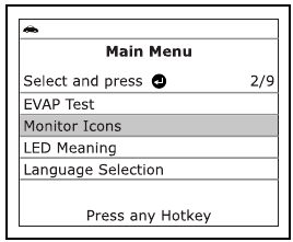 Ikone I/M MONITOR STATUS na LCD-zaslonu skenerja zagotavljajo prikaz stanja »Dokončano/Nedokončano« za vse monitorje I/M, ki jih podpira vozilo, ki ga testirate. Funkcija Monitor Icons prikaže polno ime za vsako ikono monitorja.