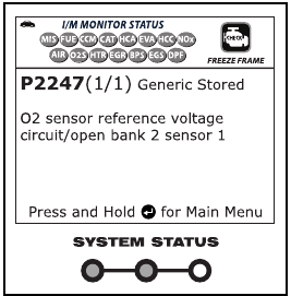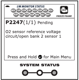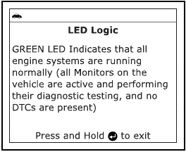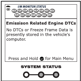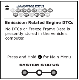Diode LED SYSTEM STATUS na skenerju zagotavljajo vizualni prikaz stanja pripravljenosti I/M vozila, ki ga testirate. Funkcija LED Meaning zagotavlja opis pomenov zelenih, rumenih in rdečih diod LED SYSTEM STATUS.