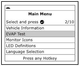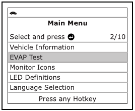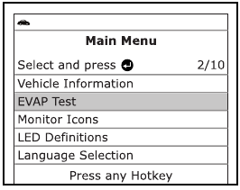 , da označite EVAP Test, nato pritisnite gumb ENTER
