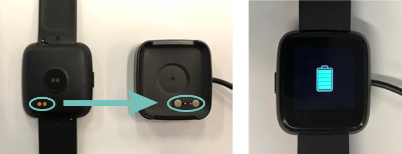 - Postavite uro na vrh podstavka tako, da so priključki za polnjenje na zadnji strani ure poravnani s priključki za polnjenje na podstavku za polnjenje. Ko je pravilno poravnano, se bo zaskočilo v položaj.
