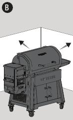 - Vzdrževati je treba najmanjšo razdaljo 914 mm (36 palcev) od gorljivih konstrukcij do strani žara in 914 mm (36 palcev) od zadnje strani žara do gorljivih konstrukcij. Naprave ne nameščajte na gorljiva tla ali tla, zaščitena z gorljivimi površinami, razen če ste od pristojnih organov pridobili ustrezna dovoljenja in soglasja. Te naprave ne uporabljajte v zaprtih prostorih, v zaprtem ali prezračevanem prostoru, v notranjosti domov, vozil, šotorov, garaž. Te naprave za kurjenje lesnih pelet ne smete postaviti pod nadzemni gorljivi strop ali previs. Žar imejte na območju, ki je čisto in brez gorljivih materialov, bencina in drugih vnetljivih hlapov in tekočin.