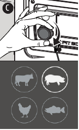 Priključite adapter mesne sonde na katero koli od priključnih vrat. Odčitek se bo pojavil na zaslonu za izbrano ustrezno mesno sondo. Levo priključno mesto za sondo je P1, desno priključno mesto za sondo pa P2. - Ciljna temperatura