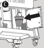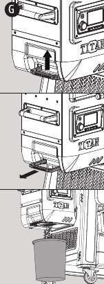 Odprite omarico vozička, da dobite dostop. Enostavno sprostite zaskočni zapah, da odstranite posodo za kurjenje, izpraznite pepel in jo vrnete v položaj. Naj bo zaskočni zapah varen, da se izognete izgubi toplote med uporabo.