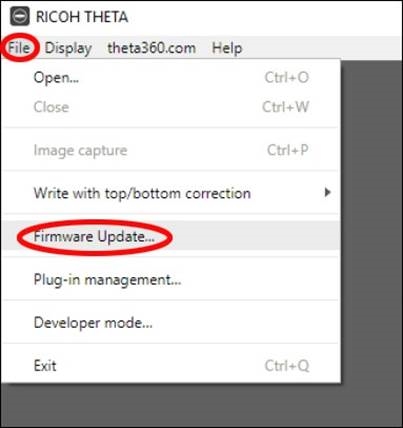 Opomba: Zelena LED dioda med tem korakom morda ne bo svetila, odvisno od stopnje napolnjenosti fotoaparata Theta. - Ko je aplikacija RICOH THETA odprta, kliknite File (Datoteka).
