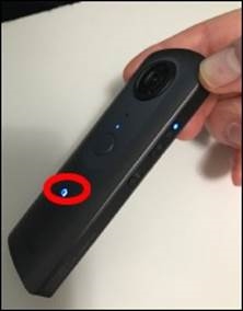 - Ko je fotoaparat Theta priključen, pritisnite gumb za vklop (zgornji gumb). Modra LED dioda na sprednji strani fotoaparata se bo vklopila in ikona fotoaparata bo svetila.