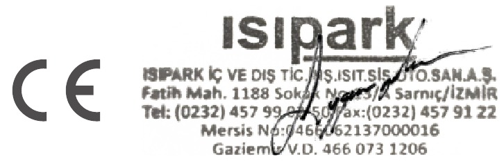 ISIPARK İÇ VE DIŞ TİC. İNŞ. ISITMA SİSTEMLERİ OTO. SAN.A.Ş. e cila ka Zyrën Qendrore dhe vendin e prodhimit të vendosur në Fatih Mah. 1188 Sk. Nr: 13/A Sarnıç - Gaziemir - İZMİR – TÜRKİYE konfirmon dhe deklaron se produkti i shënuar me CE dhe specifikimet e tij më poshtë mbulohet nga dispozitat e direktivës së përmendur.