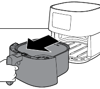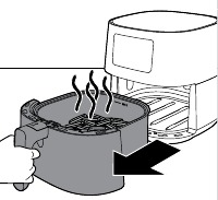- Gjatë skuqjes me ajër të nxehtë, avull i nxehtë lëshohet nëpër hapjet e daljes së ajrit. Mbajini duart dhe fytyrën tuaj në një distancë të sigurt nga avulli dhe nga hapjet e daljes së ajrit. Gjithashtu, kini kujdes nga avulli i nxehtë dhe ajri kur e hiqni tiganin nga pajisja.
