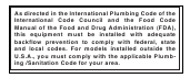 Siç udhëzohet në Kodin Ndërkombëtar të Hidraulikës të Këshillit Ndërkombëtar të Kodeve dhe Manualin e Kodit Ushqimor të Administratës së Ushqimit dhe Barnave (FDA), kjo pajisje duhet të instalohet me parandalim adekuat të rrjedhjes së kundërt për të përmbushur kodet federale, shtetërore dhe lokale. Për modelet e instaluara jashtë SHBA-së, duhet të pajtoheni me Kodin e zbatueshëm të Hidraulikës/Sanitacionit për zonën tuaj.