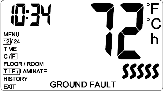 Testi është i suksesshëm nëse LED-i i kuq në të djathtë të termostatit pulson një herë në dy sekonda dhe "GROUND FAULT" (defekt në tokë) shfaqet në ekran. Nëse kjo nuk ndodh, kontrolloni instalimin.