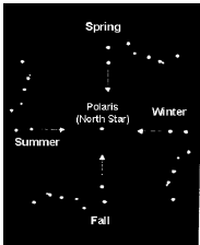 Dy yjet në pjesën e përparme të tasit të Dipperit të Madh tregojnë drejt Polarisit i cili është më pak se një gradë nga poli i vërtetë (verior) qiellor. Cassiopeia, yjësia në formë "W", është në anën e kundërt të polit nga Dipperi i Madh. Poli Qiellor Verior (N.C.P.) shënohet me "