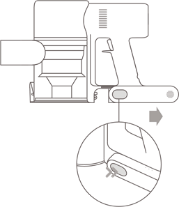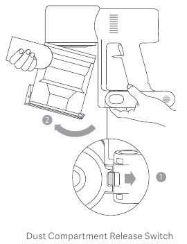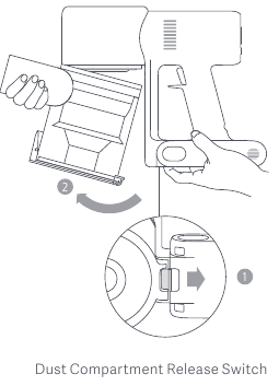 - Shtyjeni çelësin e lëshimit të kompartimentit të pluhurit në drejtimin e treguar nga shigjeta, pastaj hiqeni butësisht kompartimentin e pluhurit nga fshesa me korrent.