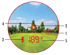 Për ta përdorur, rreshtoni retikulin e rrethit të synimit mbi flamurin që dëshironi të matni distancën. Më pas, shtypni dhe mbani butonin POWER (fuqia) dhe lëvizni lazerin ngadalë mbi flamurin ose objektin e dëshiruar derisa një rreth të rrethojë treguesin e flamurit. Nëse rrezja lazer njohu më shumë se një objekt (d.m.th. flamurin dhe pemët e sfondit), do të shfaqet distanca e flamurit dhe një rreth do të rrethojë treguesin PinSeeker™ duke e informuar përdoruesin se distanca deri te flamuri (d.m.th. objekti më i afërt) po shfaqet në VDT™ (siç shihet më poshtë). Mund të ketë raste kur rrezja lazer sheh vetëm një objekt në rrugën e saj. Në këtë rast, distanca do të shfaqet, por për shkak se nuk u fitua më shumë se një objekt, një rreth nuk do të rrethojë treguesin e flamurit.