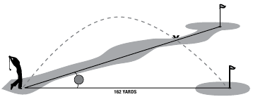 Distanca deri te flamuri A në vizatimin më poshtë është 162 jardë. Është gjithashtu 162 jardë deri te flamuri B megjithëse është në një pjerrësi. Megjithatë, nëse do ta luanit këtë vrimë si 162 jardë, topi (X) do të binte para vrimës/flamurit sepse nuk e keni marrë parasysh pjerrësinë.