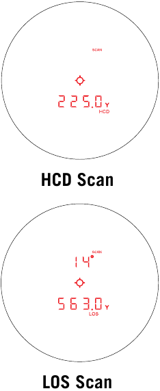 Pasi të aktivizoni Zgjedhjen e Mënyrës/Shfaqjes, shtypni butonin "Measure" (Mato) për të kaluar midis shfaqjeve HCD dhe LOS. Shtypni butonin "Menu" (Meny) për të ruajtur zgjedhjen tuaj të dëshiruar dhe për të kaluar në ekranin e zgjedhjes së Jardëve/Metrave.