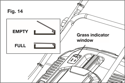 - Nëse çanta e grumbullimit të barit është bosh ose nuk është plotësisht e mbushur me bar, dritarja e treguesit të barit do të mbetet e hapur (për shkak të rrjedhës së ajrit) ose do të hapet dhe mbyllet ndërsa bari grumbullohet në çantë (Fig. 14).