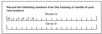 Kur të kontaktoni kompaninë ose të riporositni pjesë, do t'ju duhet të jepni modelin dhe numrat serialë të produktit tuaj. Këto gjenden në etiketën e ngjitur në kutinë ose dorezën e kositëses suaj të barit. Kopjoni këta numra në hapësirën e dhënë më poshtë.