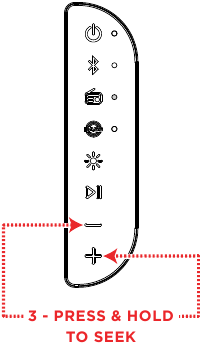 Shtypeni këtë buton për të rritur volumin e riprodhimit. Në modalitetin Bluetooth, shtypni dhe mbani këtë buton për të kaluar në këngën tjetër. Në modalitetin Radio, shtypni dhe mbani këtë buton për të kërkuar stacionin më të fortë të ardhshëm.