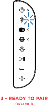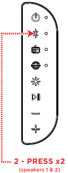 - Shtypni dy herë butonin Bluetooth në një altoparlant. Përsëriteni këtë për altoparlantin e dytë. Altoparlantët do të kërkojnë njëri-tjetrin për t'u lidhur ndërsa LED-et blu pranë butonave Bluetooth fillojnë të pulsojnë shpejt.
