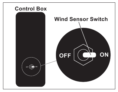 Tenda A & E WeatherPro është e pajisur me një pajisje që ndjen erën, e cila do ta mbyllë automatikisht tendën kur ka kushte ere që mund ta dëmtojnë tendën. Për të aktivizuar veçorinë e ndjesisë së erës, kthejeni çelësin e sensorit të erës në pozicionin "ON" (ndezur). Ai ndodhet në anën e majtë të kutisë së kontrollit. Me çelësin në pozicionin "OFF" (fikur), tenda nuk do të ndikohet nga erërat e forta dhe do të qëndrojë e hapur dhe mund të shkaktojë dëme në tendë. Çelësi i sensorit të erës është vendosur në pozicionin "ON" (ndezur) në fabrikë.