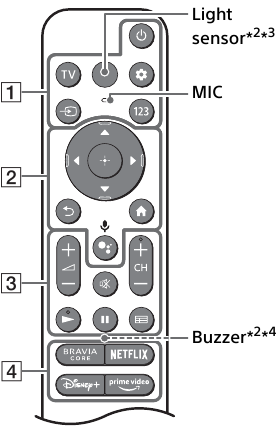 Forma, paraqitja, disponueshmëria dhe funksioni i butonave të telekomandës mund të ndryshojnë në varësi të rajonit/vendit/modelit të televizorit/cilësimeve të televizorit*1.