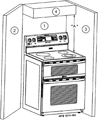 "A" = 30 inç (76.2 cm) hapësirë minimale midis pjesës së sipërme të sipërfaqes së gatimit dhe pjesës së poshtme të një dollapi druri ose metali të pambrojtur, ose "A" = 24 inç (61 cm) minimum kur pjesa e poshtme e dollapit të drurit ose metalit është e mbrojtur nga jo më pak se pllakë mulliri rezistente ndaj flakës me trashësi 1/4 inç (6.4 mm) e mbuluar me jo më pak se fletë çeliku No. 28 MSG, çelik inox me trashësi 0.015 inç (0.381 mm), alumin me trashësi 0.024 inç (0.610 mm) ose bakër me trashësi 0.020 inç (0.508 mm).