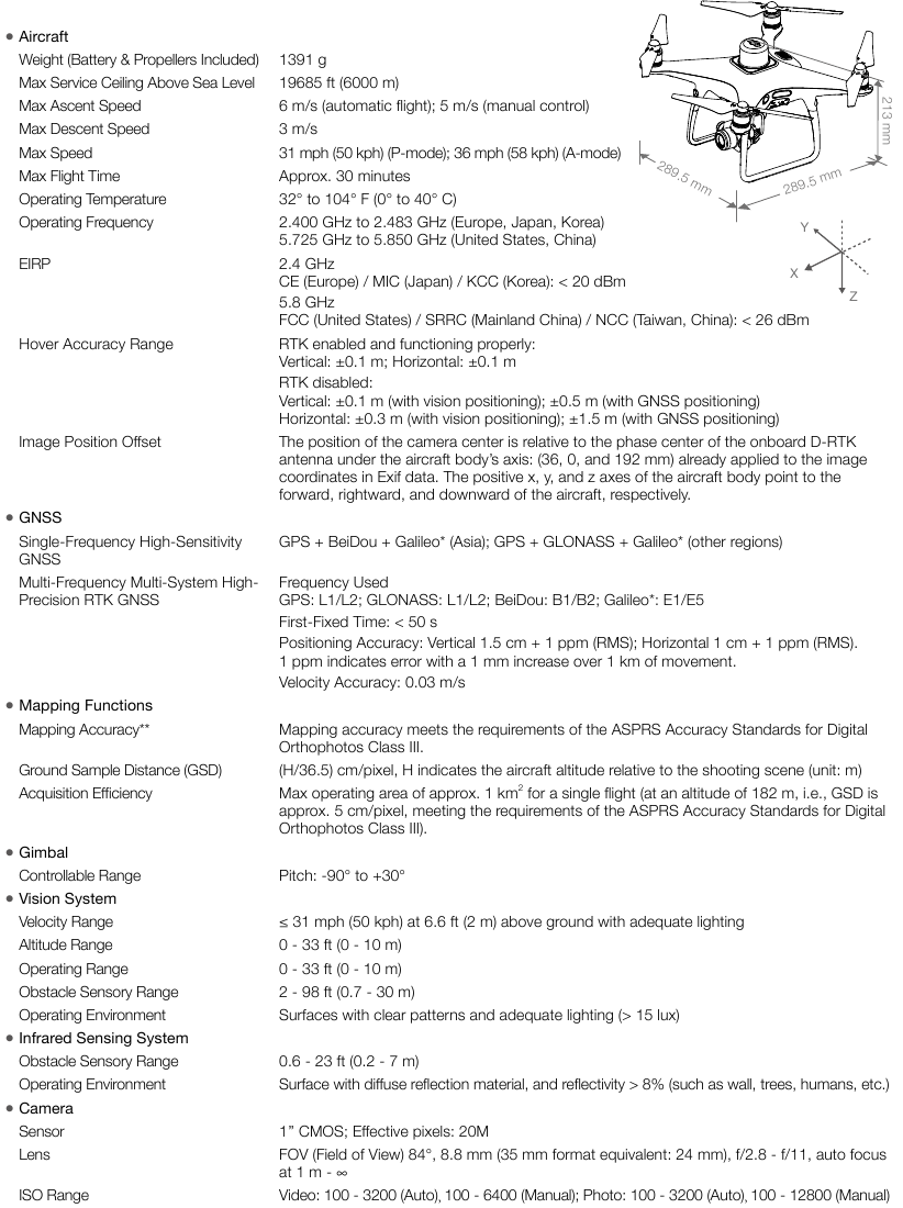 * Kjo duhet të përdoret me shërbimin Network RTK, një Stacion Mobil GNSS me Saktësi të Lartë DJI D-RTK 2 (blihet shtesë) ose të dhëna kinematike të përpunuara (PPK) (rekomandohet kur sinjali RTK është i dobët gjatë funksionimit). Sistemet e Shikimit dhe Ndjeshmërisë ndaj Infra të Kuqve ndikohen nga kushtet përreth. Lexoni Deklaratën e Mohimit të Përgjegjësisë dhe Udhëzimet e Sigurisë për të mësuar më shumë.