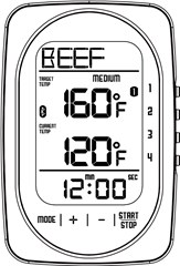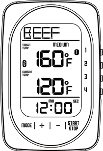 - Njia ya nyama: Gusa kitufe cha "MODE" (NJIA) kwa sekunde 2 ili kuingia kwenye njia ya uteuzi wa nyama. Chagua nyama kwa kitufe cha "+" au "-", gusa kitufe cha "MODE" (NJIA) ili kuthibitisha, na uingie kiwango cha uteuzi wa nyama, ukitumia kitufe cha "+" au "-" kuchagua ukomavu, gusa "MODE" (NJIA) ili kuthibitisha. Baada ya kuweka, gusa kitufe cha "START/STOP" (ANZA/SIMAMISHA) ili kuwasha njia ya kuweka muda.