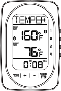 - Tumia "mode" (njia) kubadilisha njia kuwa TEMPER (JOTO), bonyeza & ushikilie "mode" (njia) kwa sekunde 2 ili kuweka joto linalolengwa na uguse "mode" (njia) tena ili kuthibitisha