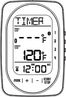 - Njia ya joto: Gusa kitufe cha "MODE" (NJIA) kwa sekunde 2 ili kuingia kwenye njia ya kuweka joto. Tumia kitufe cha "+" au "-" kuchagua kiwango cha joto na uguse kitufe cha "MODE" (NJIA) ili kuthibitisha. Baada ya kuweka, gusa kitufe cha "START/STOP" (ANZA/SIMAMISHA) ili kuwasha muda. (kiwango cha joto 100°F/38°C~464°F/240°C)