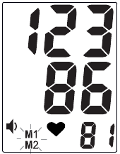 ". KWA KUWA MSUKUMO WA DAMU NA KIWANGO CHA MAPIGO YA MOYO HUPIMWA WAKATI KOFI INAPUNGUA, TAFADHALI KAA KIMYA NA USISOGEE MKONO WAKO WALA KUKAZA MSULI WAKATI WA KIPIMO. - Mwishoni mwa kipimo, kifaa kitapunguza kofi na kuonyesha matokeo ya kipimo yaliyorudiwa na ujumbe wa sauti. Alama za M1/M2 zitaanza kuwaka, zikikumbusha kuhifadhi matokeo kwenye kumbukumbu 1 au 2 kwa kubonyeza kitufe cha M1 au M2 mtawalia. Ikiwa kumbukumbu haijachaguliwa ndani ya dakika 3, matokeo hayatahifadhiwa na kifaa kitazimika kiotomatiki.