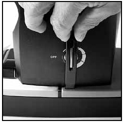 - Sakinisha kiboreshaji cha kitobo cha ESATTOTM kwa kuweka nafasi juu ya blade ya kitobo, zungusha kitobo hadi kiboreshaji kiwe wima, kisha telezesha kiboreshaji kwenye shimo kwenye msingi wa ESATTOTM. Kitobo kitashikiliwa katika nafasi ya ON (kimewashwa).