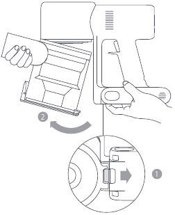 - Bonyeza kitufe cha kufungua pakiti ya betri na utelezeshe betri pakiti upande wa kulia, kama inavyoonyeshwa, ili kuiondoa.