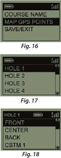 - Kisha, chagua MAP GPS POINTS (RAMANI YA POINTI ZA GPS) na ubonyeze OK/SHOT (Mchoro 16). Chagua shimo (Mchoro 17), kisha jina chaguo-msingi la pointi (Mchoro 18) na ubonyeze OK/SHOT.