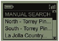 PLAY GOLF ikiwa imewekwa alama, bonyeza OK. Skrini itaonyesha kuwa kifaa kinatafuta MAENEO YA GOFU YA KARIBU. Ikiwa haifanyi hivyo, na unaona ujumbe huu: "Not enough satellites for local search. Press OK to start manual search." (Hakuna satelaiti za kutosha kwa ajili ya utafutaji wa eneo. Bonyeza OK ili kuanza utafutaji wa mwenyewe)", bonyeza OK/SHOT na ufuate utaratibu wa UTAFUTAJI WA MWENYEWE ulioelezwa katika aya inayofuata*. Utafutaji ukikamilika, orodha ya maeneo ya gofu kwa mpangilio wa umbali wao kutoka eneo lako la sasa itaonyeshwa. Chagua eneo unalotaka kutoka kwenye orodha na ubonyeze OK/SHOT.