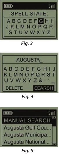 Chaguo la utafutaji wa mwenyewe pia linapatikana. Ikiwa maeneo hayapatikani, au lile unalotaka kucheza halijaorodheshwa (kama vile maelezo ya GPS kwa maeneo mapya yanaongezwa kwenye hifadhidata ya iGolf.com, litapatikana kupitia akaunti yako ya mtumiaji), chagua MANUAL SEARCH (UTAFUTAJI WA MWENYEWE) na ubonyeze OK/SHOT, kisha uweke jina la jimbo kwa kutumia vitufe vya UP/DOWN (Mchoro 3). Chagua DELETE (FUTA) na ubonyeze OK/SHOT ikiwa umefanya makosa. Ukipata matokeo mengi, chagua jimbo kutoka kwenye orodha na ubonyeze OK/SHOT, kisha uweke jina la eneo (angalau herufi chache za kwanza) (Mchoro 4). Unapomaliza, chagua "SEARCH" (TAFUTA) na ubonyeze OK/SHOT. Kisha unapaswa kuwa na uwezo wa kuchagua eneo kutoka kwa matokeo ya utafutaji (Mchoro 5).