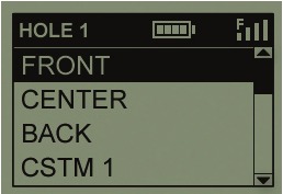 Ukishachagua eneo lako, skrini itakuonyesha umbali kutoka eneo lako la sasa hadi katikati (tarakimu kubwa zaidi), mbele (F) na nyuma (B) ya kijani kwa shimo la kwanza la eneo (Mchoro 6).