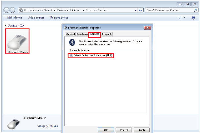 - Baada ya kukamilisha muunganisho. Bofya mara mbili kipanya kwa Bluetooth Mouse (Kipanya cha Bluetooth) Properties (Sifa) → Chagua kichupo cha Service (Huduma) → Bofya Drivers for Keyboard, Mic, ect (HID) (Viendeshaji vya Kibodi, Maikrofoni, n.k. (HID))