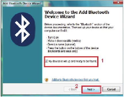 - Kwenye Add Bluetooth™ Device Wizard (Mchawi wa Kuongeza Kifaa cha Bluetooth™) chagua My device is set up and ready to be found (Kifaa changu kimewekwa na kiko tayari kupatikana) na ubofye Next (Inayofuata).