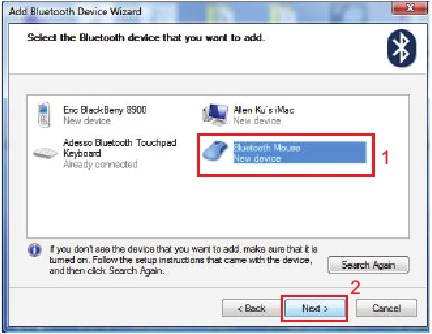 - Chagua Bluetooth Mouse (Kipanya cha Bluetooth) kutoka kwenye orodha ya kifaa cha Bluetooth unachotaka kuongeza na kisha ubofye Next (Inayofuata).