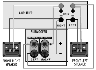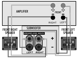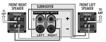 Miunganisho ya Spika ya kiwango cha juu inapaswa kutumika tu ikiwa amplifier yako haina pato la subwoofer la kiwango cha laini. Katika muunganisho huu subwoofer hulishwa pamoja na vipaza sauti vya Mbele. Kwa hili utahitaji nyaya mbili za ziada za msingi pacha. Chagua kebo ya spika ya sauti ya ubora mzuri ya ukubwa unaofaa. Epuka kutumia nyaya za bei nafuu za 'kengele' au 'zipu'. Kebo ya spika ya sauti ina mstari wa polarity au ubavu kando ya kondakta mmoja ili kurahisisha kuunganisha spika zako.