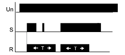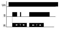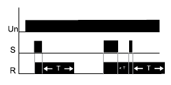 - Ucheleweshaji wa OFF na Ingizo la Udhibiti: Wakati voltage ya usambazaji na ishara ya kichochezi inapotumika, relay ya pato hubadilika kuwa nafasi ya ON (imewashwa). Wakati ishara ya kichochezi inakatizwa, muda t unaanza kuhesabiwa na relay ya pato hubadilika kuwa nafasi ya OFF (imezimwa) mwishoni mwa muda. Ikiwa ishara ya kichochezi inatumika tena kabla ya muda t kuisha, muda ambao tayari umeisha unafutwa. Muda unaanza tena wakati ishara ya kichochezi inakatizwa.