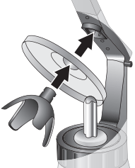 - Pumzisha lever katika nafasi ya juu. Telezesha bakuli la uwazi (G) kwenye shimoni la plastiki nyeusi la kibonyezo cha machungwa. Panga bakuli la uwazi (G) ili mdomo wa plastiki wa kumiminia (G1) uwe mbele, upande wa kushoto wa katikati (nafasi ya 7:00), kisha geuza kinyume cha saa ili mdomo wa kumiminia (G1) uwe katikati na bakuli lifungwe mahali pake.