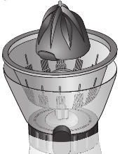 - Geuza kitufe cha kuchagua ON/OFF (WASHA/ZIMA) (K) hadi nafasi ya MANUAL (MWONGOZO). Weka tunda lako upande uliokatwa chini kwenye koni (E), ukitoa shinikizo dhidi ya koni. Koni itaanza kuzunguka kiotomatiki mara tu shinikizo litakapotolewa. Weka tunda katikati na uweke shinikizo la mara kwa mara kwa matokeo bora.