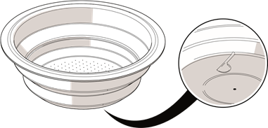 Mashine ya kahawa huja na vichujio vitatu: kichujio cha kikombe kimoja, kichujio cha vikombe viwili, na kichujio laini cha podi. Chini ya kila kichujio utapata alama inayolingana.
