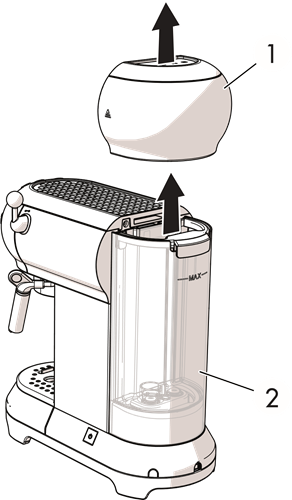 - Ondoa kifuniko (1) kwa kukivuta juu na kisha uvute tanki (2) nje.
