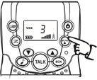 Wakati VOX imeamilishwa, hakuna haja ya kubonyeza kitufe cha TALK (zungumza) ili kuzungumza. Gusa kitufe cha MENU mara tatu, kisha "VOX" na kiwango cha usikivu cha VOX (OF,01,02,03) kitaonyeshwa kwenye skrini.