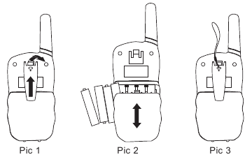 Hakikisha redio imezimwa; Ondoa klipu ya mkanda; Telezesha na uinue kifuniko cha sehemu ya betri; Ingiza betri 4 za AAA na polarity sahihi kwenye kila redio; Funga kifuniko cha betri na uambatishe klipu ya mkanda. (Kumbuka: Tafadhali ondoa betri ikiwa vitengo havitumiki kwa muda mrefu)